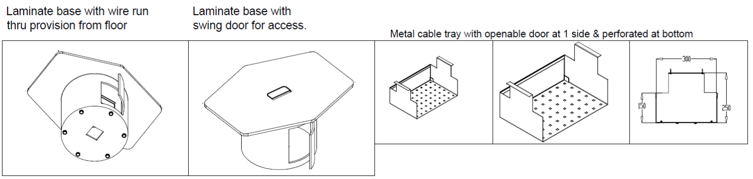 Laminate flip-up, wire run through base & cable tray